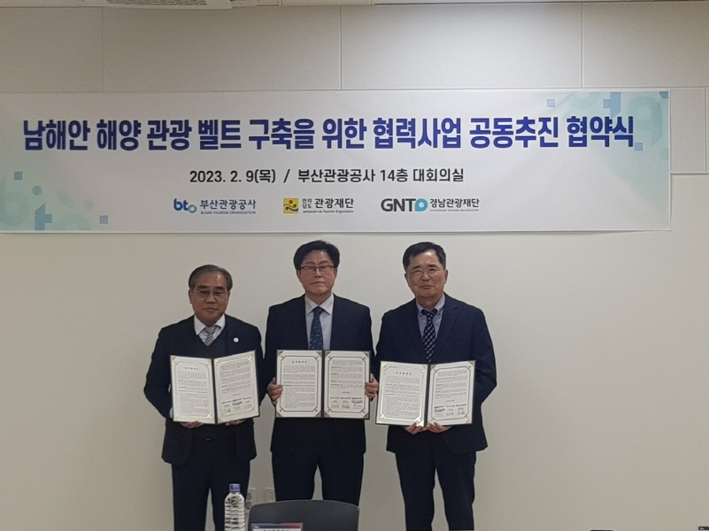 경남관광재단은 9일 부산관광공사 회의실에서 부산관광공사, 전남관광재단과 함께 ‘남해안 글로벌 관광 거점’ 조성 공동 업무협약을 체결하였다고 밝혔다.