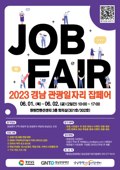 경남관광재단 관계자는 “잡페어 행사는 구직자와 구인기업 간 상담창구 마련뿐만 아니라 일반인 참가자를 위해 다양한 행사들도 준비되어 있으니, 많은 관심 부탁드린다”고 말했다.