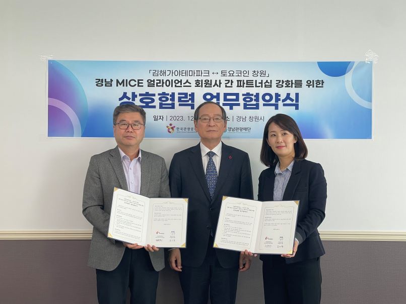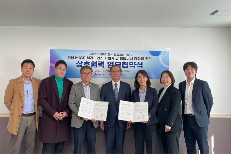경남관광재단은 7일 도내 관광·마이스 업계 동반성장을 위해 ‘경남 마이스 얼라이언스(이하 ’GNMA‘)’ 회원사인 ‘김해가야테마파크’와 ‘토요코인 창원’이 업무협약을 체결했다고 밝혔다.