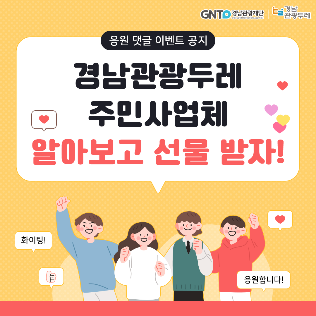 이번 이벤트는 올해 선정된 주민사업체 중 법인 형태를 갖추며 지역에 특화된 관광상품 또는 서비스를 판매하는 ▲ 통영 그림도시협동조합(공예기념품 판매), ▲ 거제막걸리(지역 전통주 판매), ▲ 거제서핑클럽(해양레저 체험), ▲거제 하카협동조합(아웃도어 체험관광), ▲거제시관광기념품협동조합(지역기념품), ▲거제 주식회사 멋(섬 테마여행), ▲남해 회룡마을(숙박 및 치유관광체험) 7개 주민사업체 관련 카드뉴스를 이벤트 참가자 본인 사회관계망서비스(SNS)에 공유, 댓글 응원, 해시태그 작성 등을 수행하면 추첨을 통해 경남관광기념품점에서 판매 중인 인기 기념품을 패키지(3만 원 상당)로 제공한다.