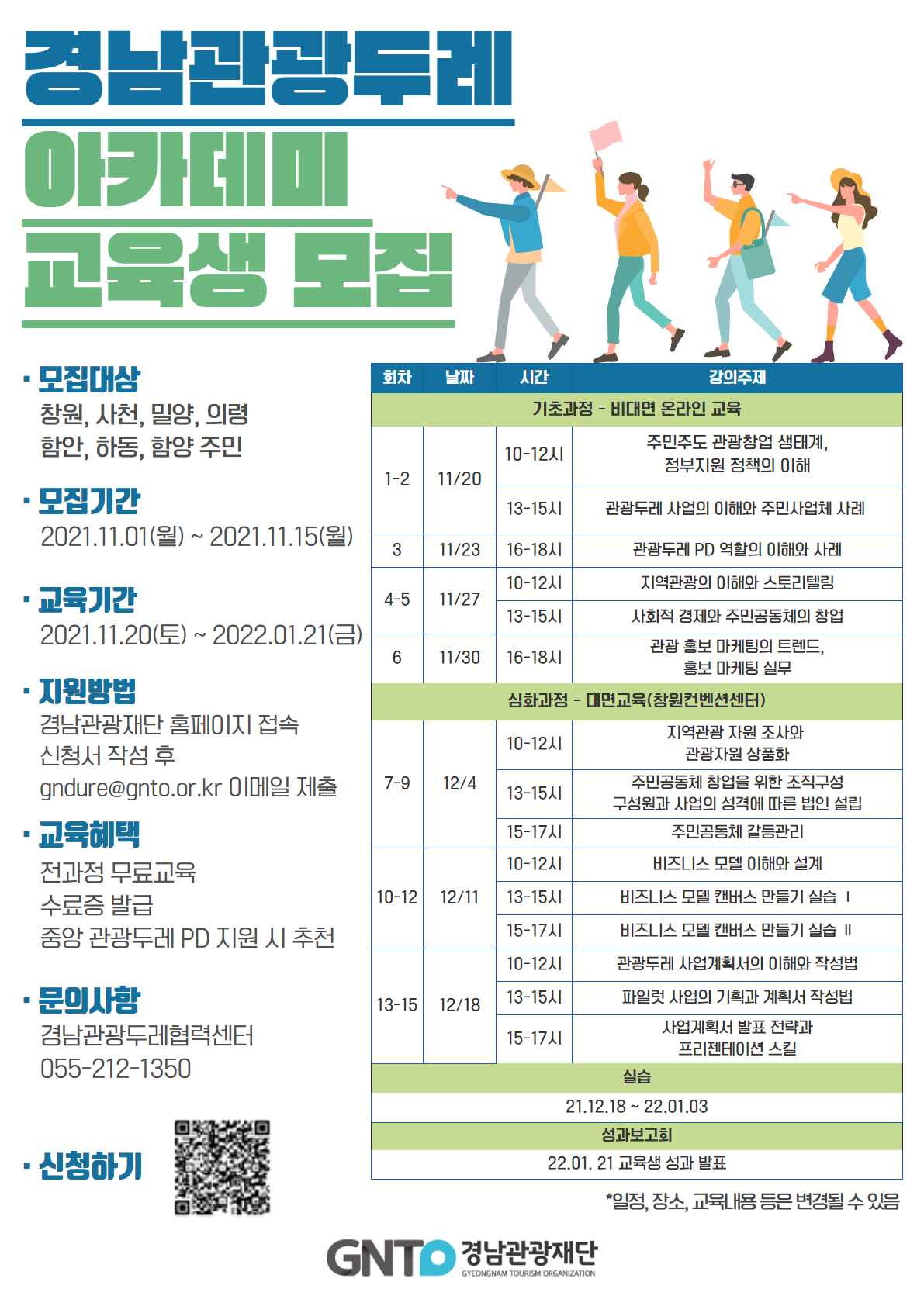 ‘경남 관광두레 아카데미’ 참여를 희망하는 경우 경남관광재단 누리집에 공고된 신청서와 증빙서류를 11월 15일 월요일 18시까지 이메일(gndure@gnto.or.kr)로 접수하면 된다.
