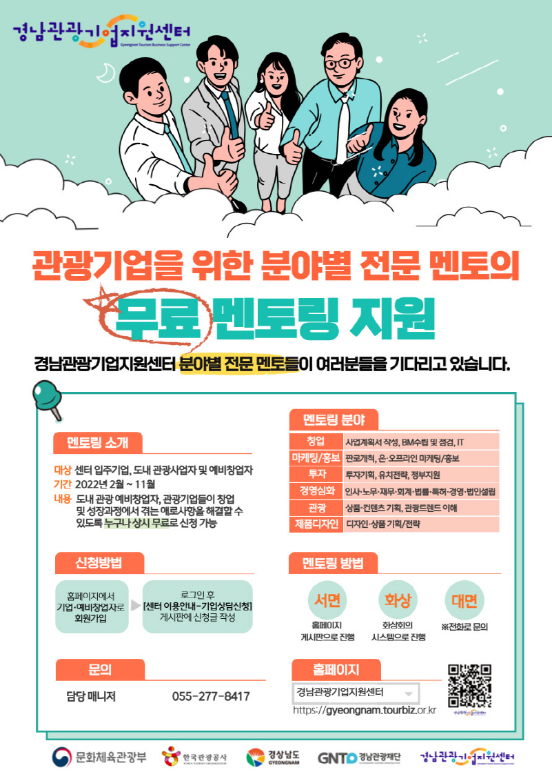멘토링 프로그램은 경남관광기업지원센터에서 주관하며 관광 관련 도내 예비창업자와 기존 사업자가 창업 및 사업 구체화 과정에서 자문을 구할 수 있는 분야별 전문상담 서비스로, 창업·마케팅/홍보·투자·경영심화·관광·제품디자인 총 6개로 나뉜다.