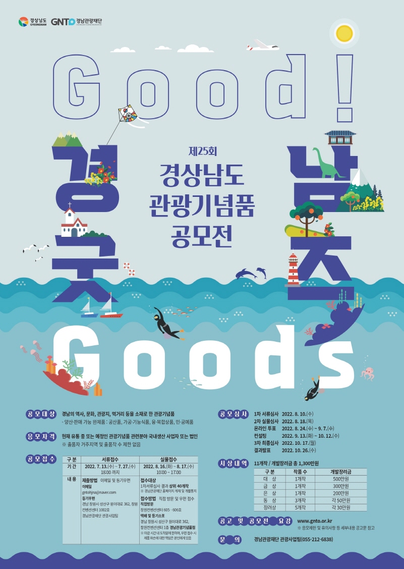 ‘GOOD! 경남 굿즈*’라는 주제로 열리는 이번 공모전은 경남의 역사, 문화, 관광지, 먹거리 등을 소재로 만들어서 대량생산 및 판매가 가능한 완제품이 관광기념품 공모 대상이다.